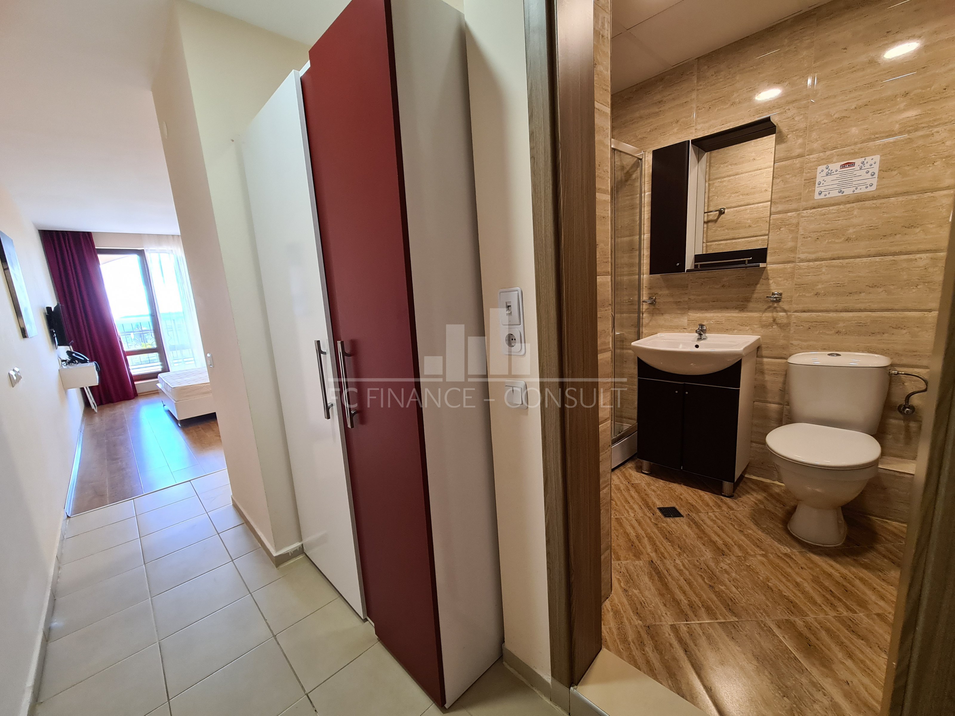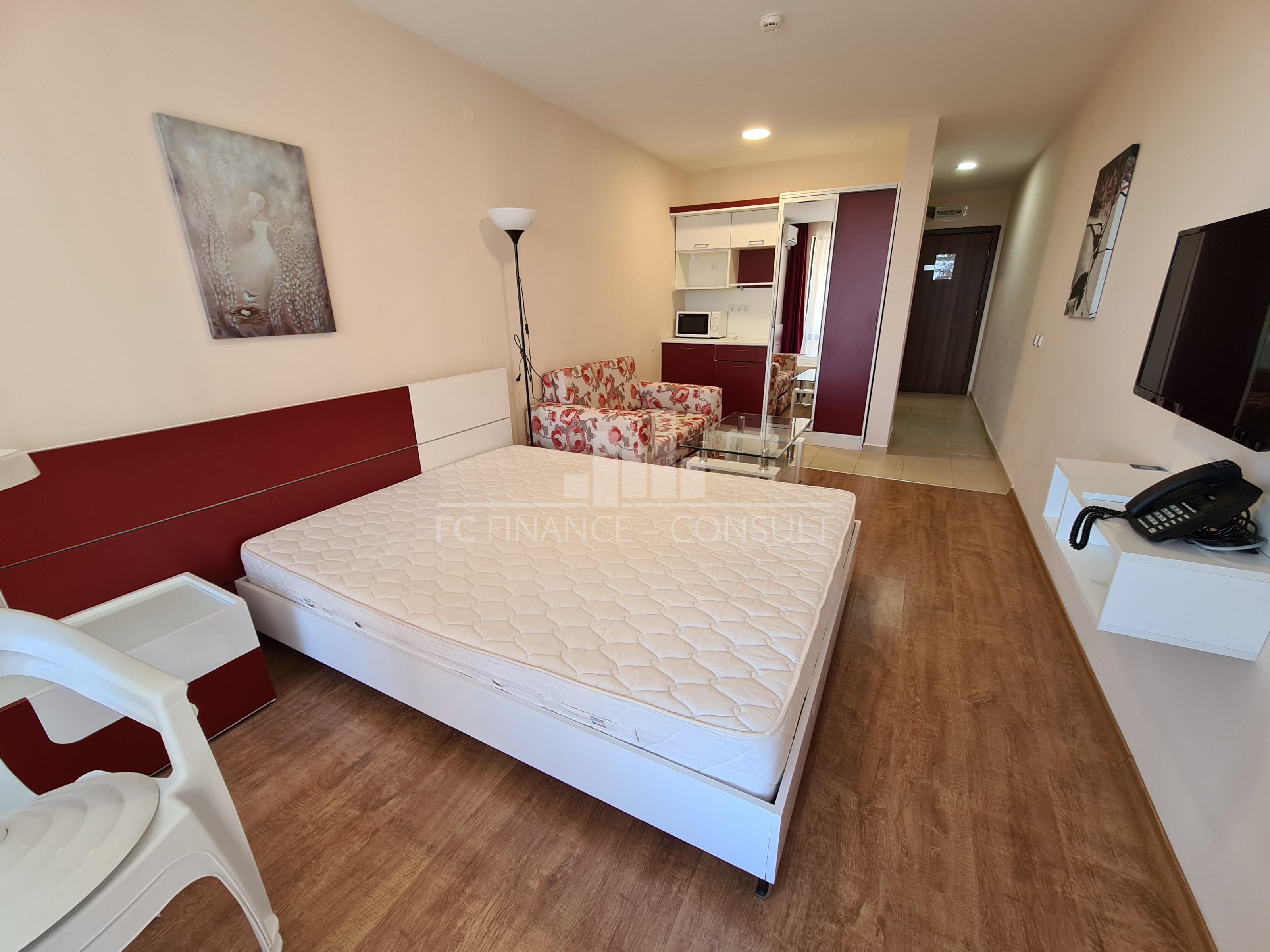 1-pokojowe mieszkanie(studio) przy plaży z widokiem na morze, Święty Włas. Opłata za zarządzanie i utrzymanie wynosi 21 € za metr kwadratowy rocznie+VAT. Opłata za podłączenie telewizji i Internetu oraz utrzymanie karty dostępu wynosi 278 euro rocznie. Wysokość ubezpieczenia dla kawalerki wynosi 50 euro, dla mieszkania z jedną sypialnią - 60 euro, a dla większych mieszkań - 70-85 euro rocznie. Opłata za prąd, gaz, wodę i wywóz śmieci wynosi 30 € rocznie. Podatek od nieruchomości i opłata za wywóz śmieci jest płacona przez firmę kontraktową i według tej samej stawki, która została ustalona przez gminę Nessebar. Właściciele apartamentów nie ponoszą dodatkowych opłat za naprawy, renowacje budynków lub rozbudowę w okolicy. Aparthotel oferuje szereg usług dodatkowych za dodatkową opłatą. Apartamenty i cały kompleks nadają się do pobytu całorocznego.